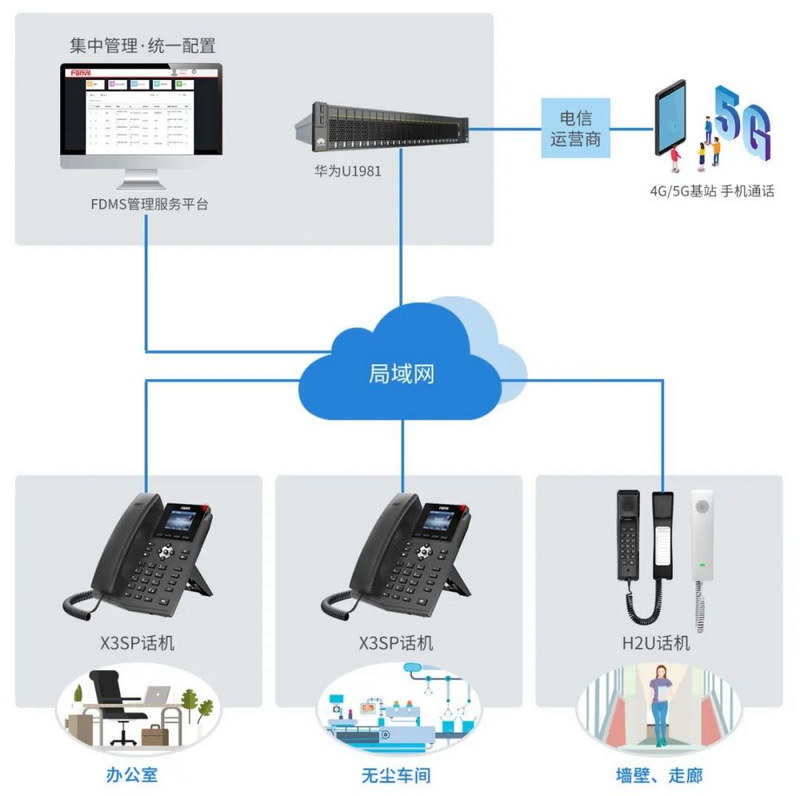 保障通信,互聯(lián)互通。在無(wú)塵車間無(wú)信號(hào)的情況下,通過(guò)方位企業(yè)辦公解決方案,實(shí)現(xiàn)X3SP辦公電話、H2U壁掛話機(jī)、WiFi手持話機(jī)等通訊設(shè)備間的互聯(lián)互通,解決車間員工與外部人員溝通難題,保持順暢溝通。