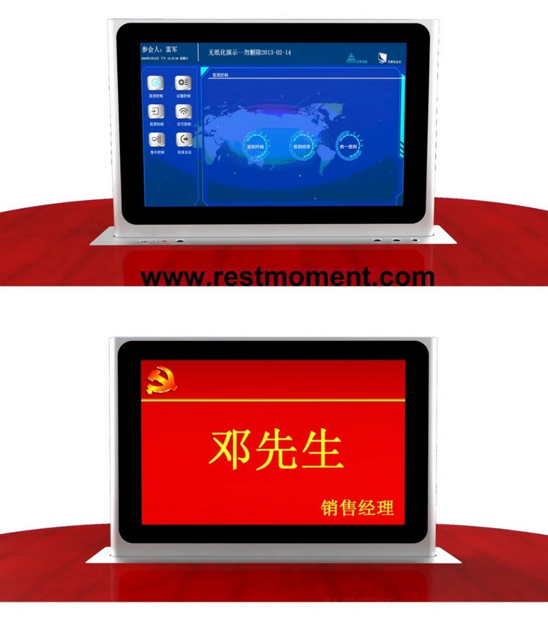 升降器和屏一體呈現(xiàn),保證運輸,維護安全便捷,也可獨立升級;多功能融合接口,一個接口解決供電,觸控,視頻所有信號;全鋁合金外殼,整體CNC設(shè)計,屏幕最厚18MM;屏幕雙面10.1英寸,物理分辨率1280*800,IPS全視角顯示屏;采用四核Cortex-A9核心28nm工藝1.4G主頻,內(nèi)存 8GbitRAM,硬盤64Gbit EMMC;雙重組網(wǎng),既支持wifi組網(wǎng)也支持RJ45網(wǎng)線組網(wǎng);雙屏可同步顯示參會人信息,支持呼叫服務(wù)、會議交流、會議信息、會議通知、投票表決等等功能。