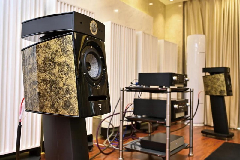 如今,全球限量50對的Diablo Utopia Colour Evo黑金限量版已經(jīng)登陸中國,有幸在Focal中國總代理廣州域豐音響位于番禺的倉儲中心試音室目睹這對外觀比照片更為漂亮的Focal旗艦書架箱,見到這對音箱的時(shí)候我讓域豐音響的工作人員先熱機(jī),茶都還沒喝一口就“奮不顧聽”一番拍攝,實(shí)物實(shí)在是太漂亮,這FocalDiablo Utopia Colour Evo黑金限量版的外觀實(shí)在太難拍了,亮色黑色鋼琴漆底上的金飾工藝都是手工的,因此每一對Diablo Utopia Colour Evo金飾紋路都不一樣,而亮色黑色鋼琴和金飾紋路會反光,拍照它箱體金色質(zhì)感和色彩很難忠實(shí)還原,我也算是攝影圈混跡多年的,多年前曾開玩笑說自己是中國書法家群體中拍攝音響現(xiàn)場器材拍得最好、拍攝音響最好的攝影師中書法寫得最好的,可在一這Diablo Utopia Colour Evo黑金限量板跟前有點(diǎn)無能為力了,一番拍攝下來也只能挑選一部分照片使用,所幸是數(shù)碼相機(jī),要是在膠卷時(shí)代恐怕是謀殺菲林了!