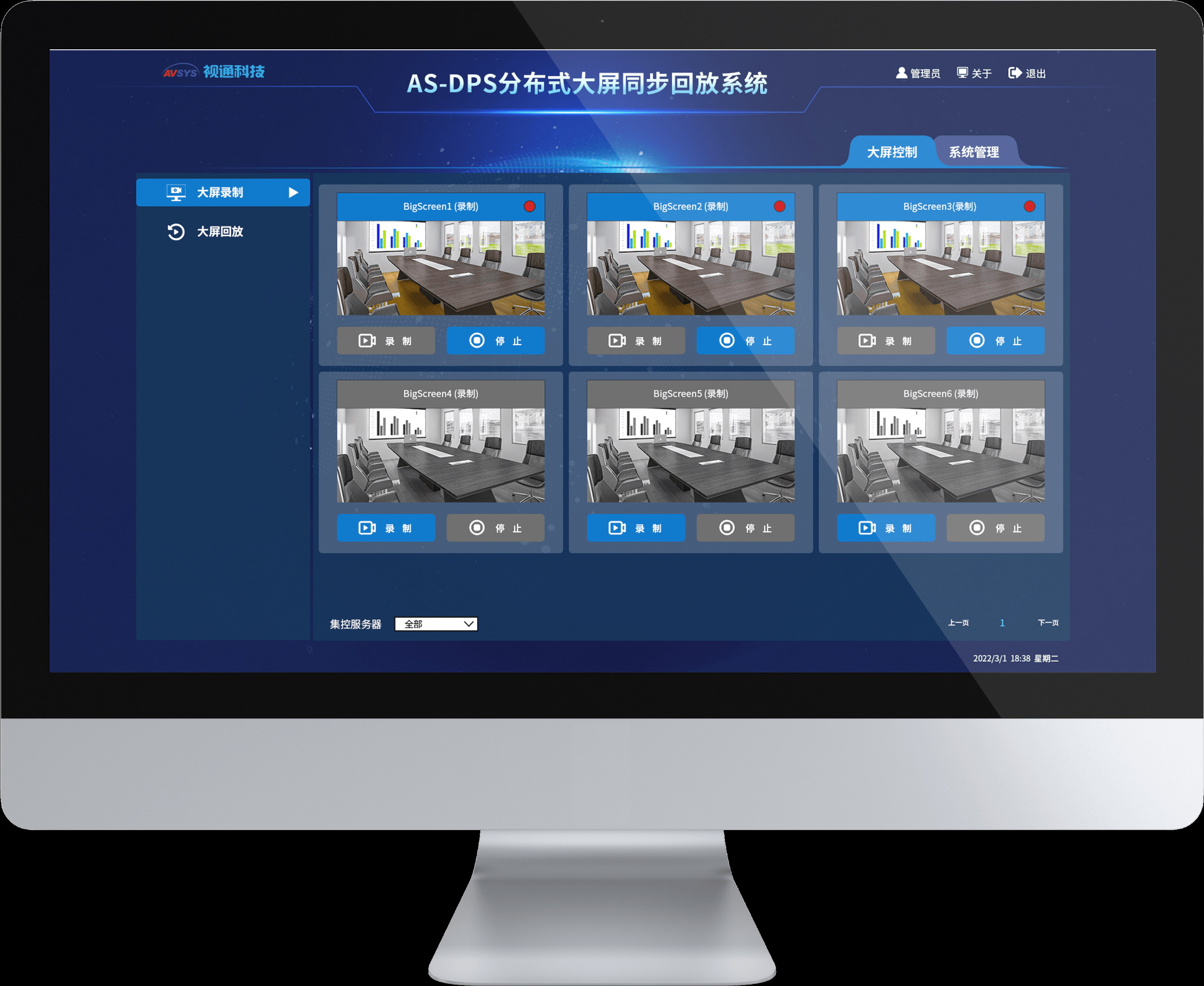 5. 多屏組錄制,系統(tǒng)支持多屏組同時錄制、分組錄制。支持多套分布式大屏回放系統(tǒng)級聯(lián),用于超大型屏幕或大量視頻同步錄制、同步回放。