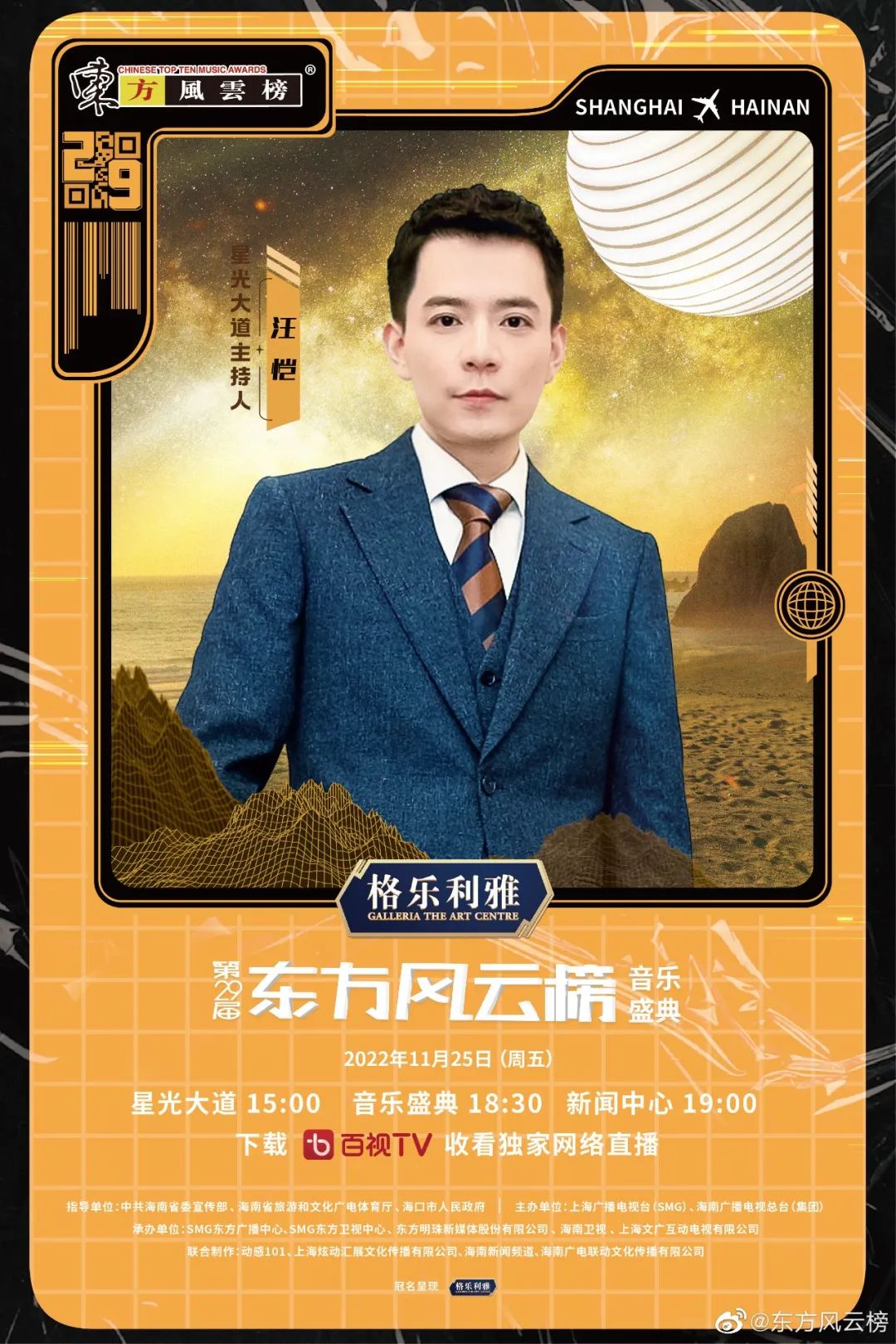 11月25日晚,格樂利雅·第29屆《東方風云榜》音樂盛典在海口市海口灣美源碼頭廣場舉辦,這是《東方風云榜》系列活動自1993年創(chuàng)立以來首次走出上海。本屆《東方風云榜》音樂盛典盤點了2021年度華語樂壇的成績單,G.E.M.鄧紫棋、GAI周延、黃齡、周深、鄭云龍等眾多歌手出席并登臺演出,現(xiàn)場是通過東方衛(wèi)視、海南衛(wèi)視、百視TV、動感101、阿基米德FM及全國音樂廣播聯(lián)盟三十余家電臺向全球播出。