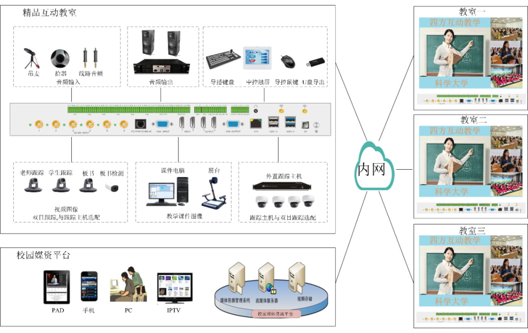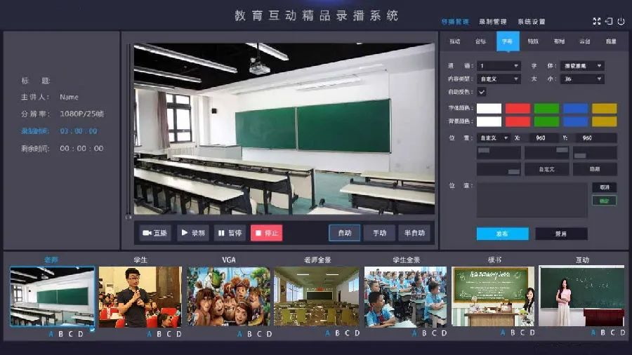 全自動(dòng)錄播系統(tǒng)主要完成教師、學(xué)生的視頻自動(dòng)跟蹤采集,音頻智能采集,教師電腦屏幕截取,教師/學(xué)生視頻/計(jì)算機(jī)畫(huà)面智能導(dǎo)播,以上信號(hào)源自動(dòng)傳送至課件實(shí)時(shí)錄制系統(tǒng)生成優(yōu)質(zhì)的精品課程,同時(shí)通過(guò)課堂直播系統(tǒng)在局域網(wǎng)、互聯(lián)網(wǎng)上直播為遠(yuǎn)端用戶提供在線實(shí)時(shí)學(xué)習(xí)的平臺(tái)。
