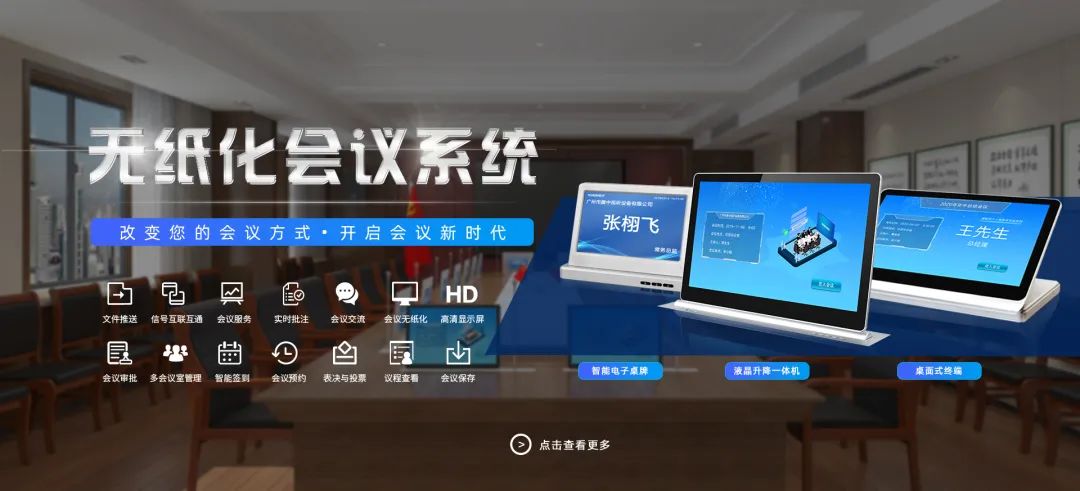 騰中無紙化辦公會議系統(tǒng)是騰中自主研發(fā)的新一代分布式跨平臺無紙化會議系統(tǒng),具有會議預(yù)約、會議簽到、資料查閱、同屏互動、會議投票、電子白板、呼叫服務(wù)、分組討論、視頻會商等功能。與會者可進行實時的會商和有效的信息溝通,改變了傳統(tǒng)會議低效、資源浪費、保密隱患等問題,實現(xiàn)會議全程無紙化。