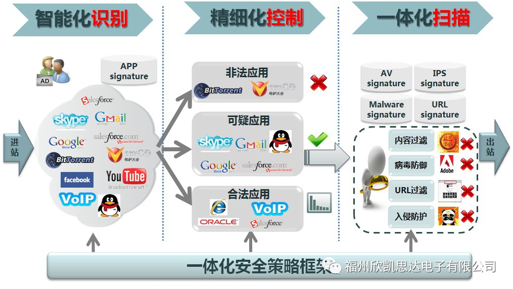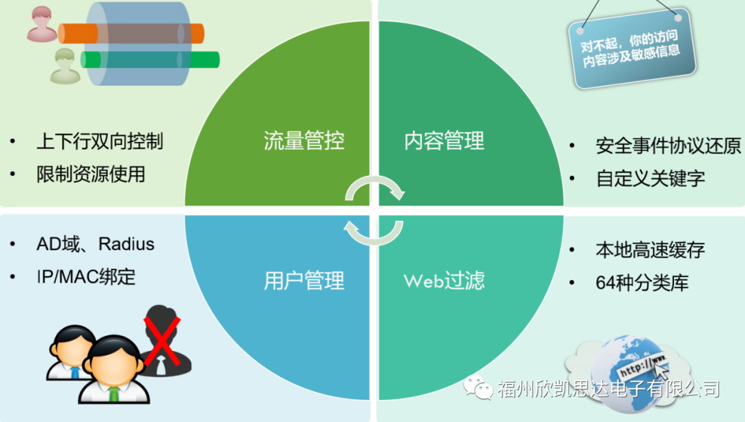 控制每個(gè)上網(wǎng)用戶的流量大小,屏蔽 P2P、在線視頻等消耗網(wǎng)絡(luò)帶寬的應(yīng)用,控制 QQ 等聊天工具的使用,禁止對(duì)色情、暴力、惡意網(wǎng)站的訪問。限制文件和非法言論的外傳。