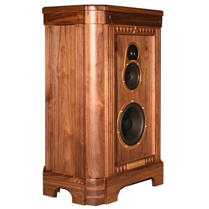 全胡桃實木外箱體:胡桃屬木材中較優(yōu)質(zhì)的一種,主要產(chǎn)自北美和歐洲。國產(chǎn)的胡桃木,顏色較淺。黑胡桃呈淺黑褐色帶紫色,弦切面為美麗的大拋物線花紋(大山紋)。黑胡桃非常昂貴。胡桃木有良好的物理穩(wěn)定性,不易變形,是高檔音箱箱體的首選制作材料。