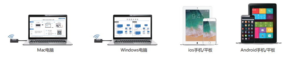 BG01桌面式無線投屏一體機支持多臺電腦,手機、平板移動設備接入投屏,多人會議分享時,最高支持16個不同種類設備同時接入,一鍵切換分享主講人。
