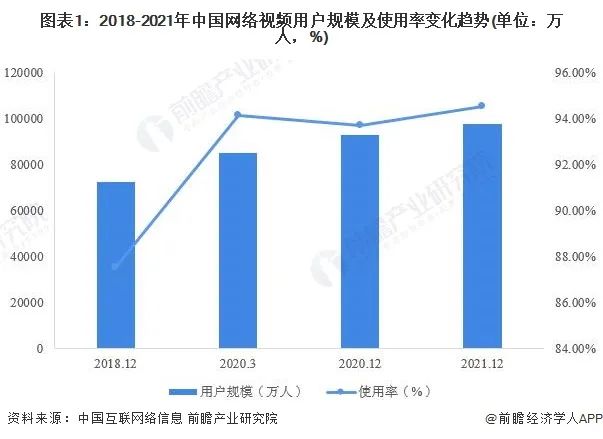 然后是持續(xù)擴大的視聽用戶規(guī)模,為傳統(tǒng)行業(yè)的發(fā)展源源不斷注入新活力。當(dāng)下視聽設(shè)備技術(shù)日趨成熟,網(wǎng)絡(luò)視聽節(jié)目制作能力和質(zhì)量提升明顯,一批優(yōu)質(zhì)作品憑借獨特的美學(xué)價值、文化內(nèi)涵與傳播特點為觀眾帶來豐富的視覺體驗。截至2021年12月,我國網(wǎng)絡(luò)視頻(含短視頻)用戶規(guī)模達(dá)9.75億,較2020年12 月增長4794萬,占網(wǎng)民整體的94.5%。