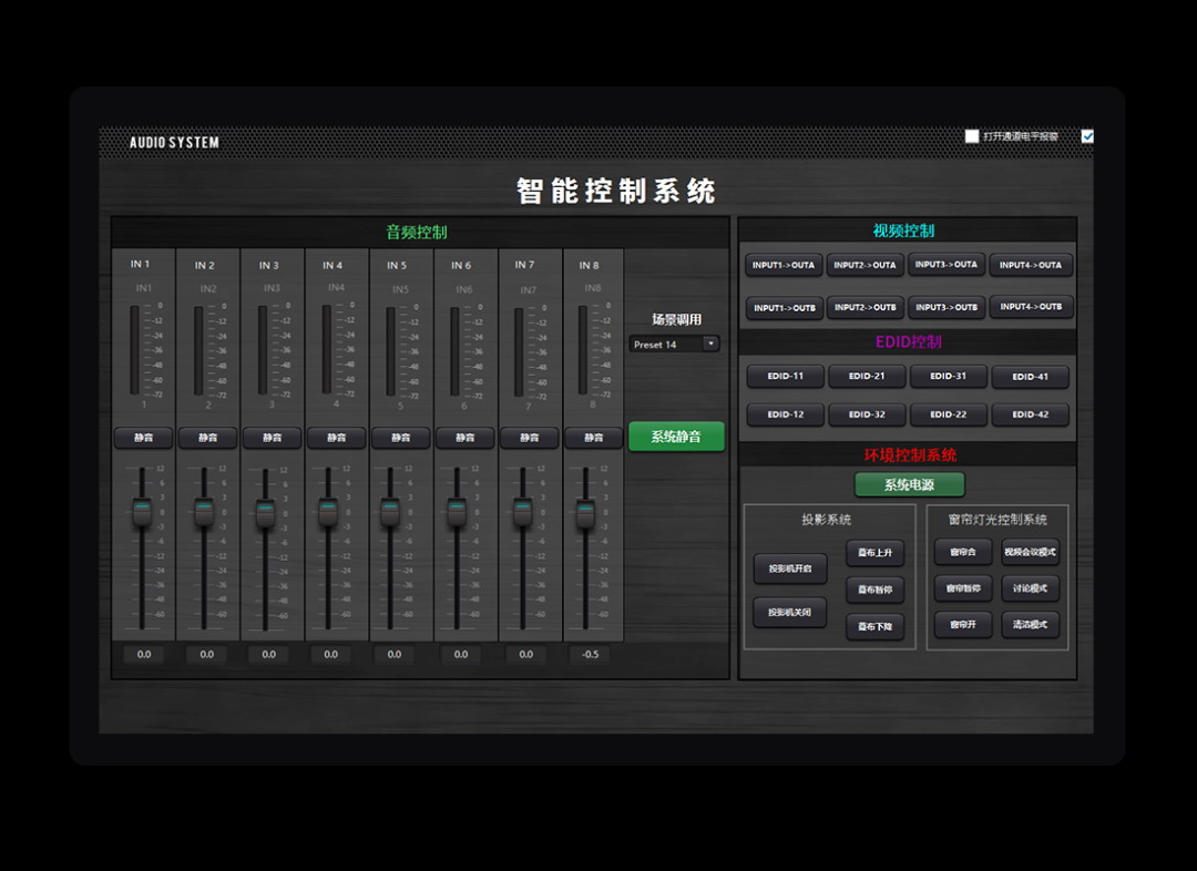 具有中央控制功能,可對(duì)系統(tǒng)中的電源、信號(hào)切換、環(huán)境控制、音頻等整體控制,實(shí)現(xiàn)一鍵開啟系統(tǒng)所需功能;