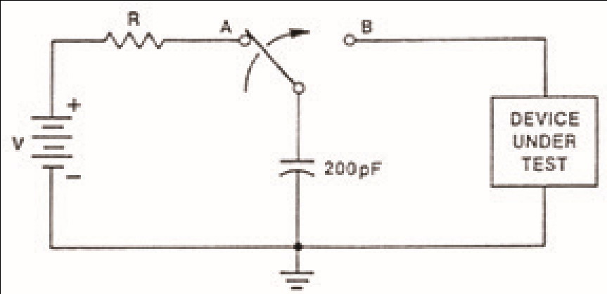 因為大多數(shù)機器都是用金屬制造的,其機器放電模式的等效電阻為0Ω,但其等效電容定為200pF。由于機器放電模式的等效電阻為0,故其放電的過程更短,在幾毫微秒到幾十毫微秒之內(nèi)會有數(shù)安培的瞬間放電電流產(chǎn)生。
