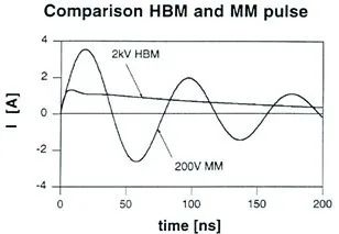 ▲人體放電模式(2KV)與機器放電模式(200V)放電電流的比較圖