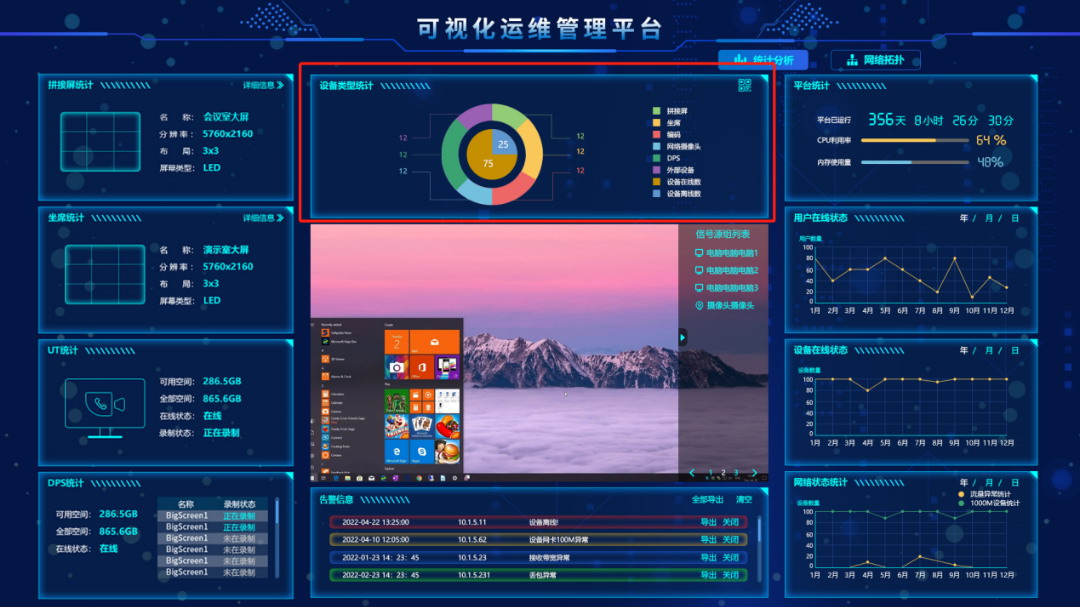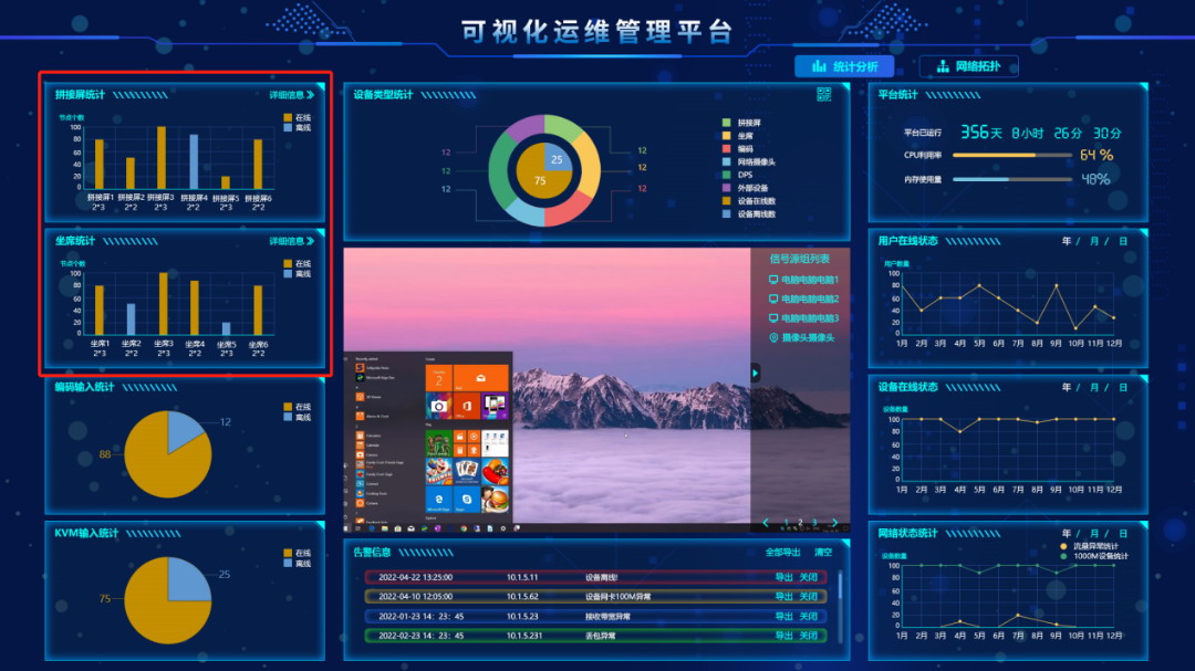 可視化運(yùn)維管理平臺(tái)集拼接屏/坐席統(tǒng)計(jì)、編碼輸入統(tǒng)計(jì)、KVM輸入統(tǒng)計(jì)、UT統(tǒng)計(jì)、DPS統(tǒng)計(jì)、平臺(tái)統(tǒng)計(jì)、用戶在線狀態(tài)、設(shè)備在線狀態(tài)、網(wǎng)絡(luò)狀態(tài)統(tǒng)計(jì)、設(shè)備類型統(tǒng)計(jì)、反監(jiān)預(yù)覽功能、告警信息欄、自動(dòng)生成網(wǎng)絡(luò)拓?fù)鋱D等功能于一體,可以直觀的展現(xiàn)系統(tǒng)中對(duì)應(yīng)設(shè)備的相關(guān)信息。
