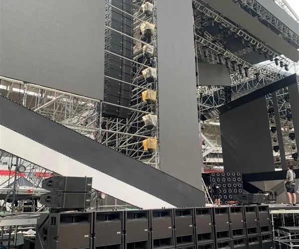 為了在球場內(nèi)實現(xiàn)均勻的聲壓級和頻率覆蓋,Way Audio設(shè)計并部署了一個系統(tǒng),在舞臺兩側(cè)并排懸掛21只STM M46主頻音箱和STM B112低頻擴展音箱,投射距離達180米。獨立懸掛的12只STM M28全方位音箱被用作延遲,12只NEXO GEO M12陣列音箱作為補充投擲140米。每側(cè)部署20只S118超低頻音箱,采用全指向模式,附加的STM M28用作前方補聲。