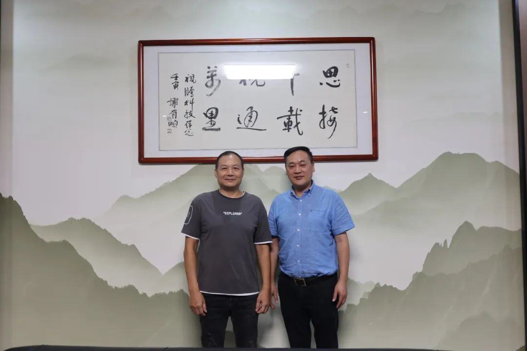 隨后,謝博導(dǎo)一行在黃總的帶領(lǐng)下來到黃總辦公室,踏入辦公室,映入眼簾的便是謝博導(dǎo)親筆所書,黃總視若珍寶裱掛于墻的書法作品“思接千載,視通萬里”,一筆一筆樸實無華而兼納乾坤的鐵畫銀鉤,是中山大學(xué)與視騰科技緊密相連的紐帶,亦是廣大中山大學(xué)學(xué)子走出校園、奔向社會實踐的橋梁。