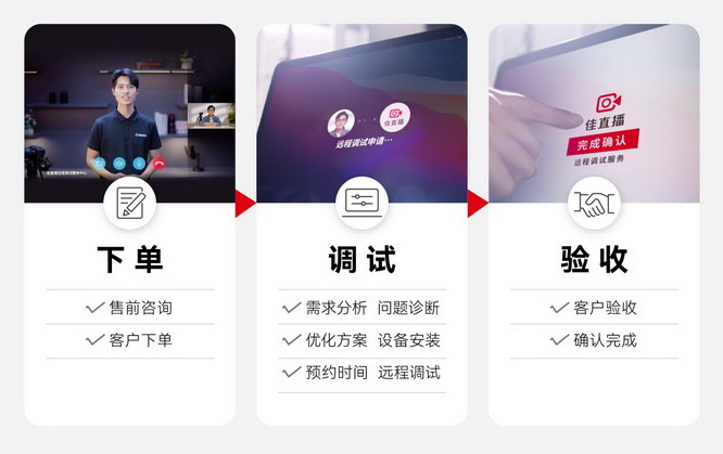 “佳直播遠(yuǎn)程調(diào)試”為確保每位客戶(hù)都能受益于一致的高質(zhì)量服務(wù),打造了“下單-調(diào)試-驗(yàn)收”的一套完整標(biāo)準(zhǔn)化服務(wù)流程。在接到客戶(hù)訂單后,遠(yuǎn)程調(diào)試中心的客服人員將致電客戶(hù)了解直播間技術(shù)調(diào)試需求,遠(yuǎn)程調(diào)試工程師將為客戶(hù)直播間提供技術(shù)分析診斷和優(yōu)化調(diào)整方案。完成以上步驟后,遠(yuǎn)程調(diào)試團(tuán)隊(duì)將在雙方預(yù)約的時(shí)間為客戶(hù)直播間做遠(yuǎn)程技術(shù)調(diào)試,在調(diào)試過(guò)程中讓客戶(hù)即刻查看效果并快速做出優(yōu)化,客戶(hù)滿(mǎn)意驗(yàn)收后完成調(diào)試流程。 根據(jù)直播行業(yè)需求快速變化的特點(diǎn),為了進(jìn)一步提升客戶(hù)體驗(yàn),在服務(wù)驗(yàn)收后7天內(nèi),客戶(hù)仍可免費(fèi)申請(qǐng)對(duì)該直播間再度優(yōu)化調(diào)試一次,希望通過(guò)這些增值服務(wù)助力客戶(hù)的直播達(dá)到更佳狀態(tài)。在遠(yuǎn)程服務(wù)中注重通過(guò)高效的溝通、友好的技術(shù)支持,創(chuàng)造更親近、舒適的遠(yuǎn)程服務(wù)體驗(yàn)。