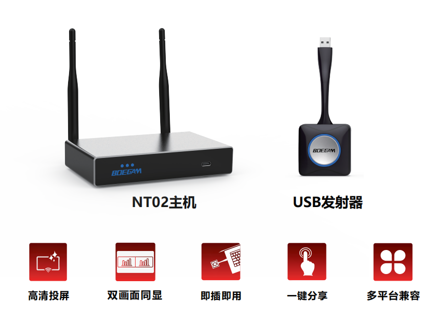 BOEGAM NT02 4K是一款基于linux系統(tǒng)嵌入式硬件架構(gòu)的無線投屏系統(tǒng),即可將手機,平板,電腦設(shè)備的內(nèi)容無線分享至顯示終端。全面兼容MAC,iOS, Android,Windows等系統(tǒng)設(shè)備。產(chǎn)品設(shè)計簡潔,外觀小巧。安裝便捷,即插即用。