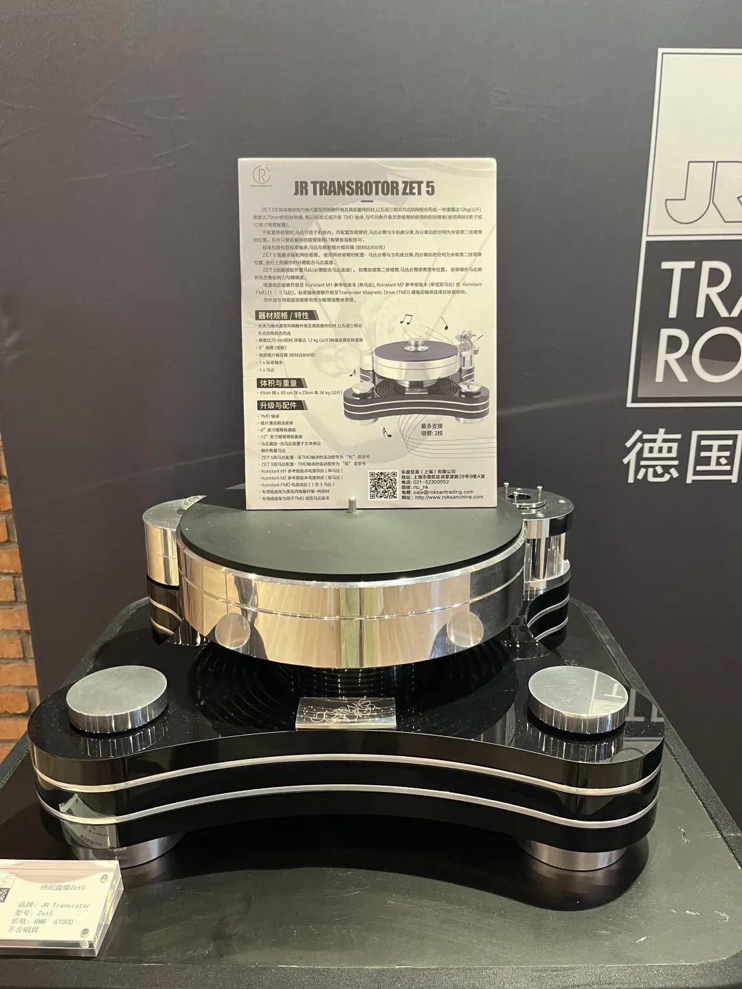JR Transrotor ZET 5, 馬達是雙同步式,有33及45轉兩級滑輪,帶動式。轉盤是鋁制的,底部有波浪紋,以吸收諧振;唱片墊是碳、膠混合物,再配上一個鋁制的重型唱片鎮(zhèn);唱臂板也是鋁制的;最后是三只重型腳座和底座,可調校唱盤的平衡和高度,它們也配上鋁制的大圓頂,看來非常大體。無論ZET 1、3或5的外型設計都是非常吸睛的。那弧形底座尤其美麗,4角向外伸延巧妙地安放了承腳、唱臂板和馬達。亞克力板是黑色的,其余所有金屬部分都是銀白色,銀、黑配非常合稱。