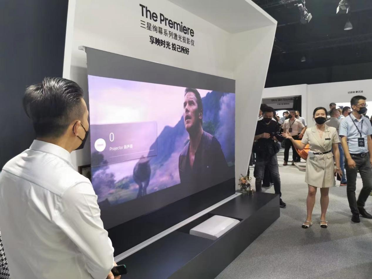 -SAMSUNG電視2022年戰(zhàn)略新品發(fā)布會(huì),圖片內(nèi)設(shè)備:三星P7激光電視&VIVIDSTORM黑柵地升幕