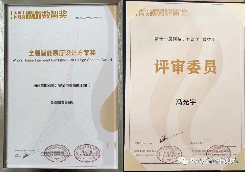 6月10日圣諦影音智能機(jī)構(gòu)總經(jīng)理馮光宇先生出席了2023年阿拉丁神燈獎(jiǎng)?lì)C獎(jiǎng)活動(dòng),馮總作為評(píng)審委員參與了第十一屆阿拉丁神燈獎(jiǎng)-數(shù)智獎(jiǎng)的評(píng)選,同時(shí)圣諦的“南京智能別墅:安全與美隱匿于細(xì)節(jié)”也獲得了“全屋智能展廳設(shè)計(jì)方案獎(jiǎng)”的殊榮。