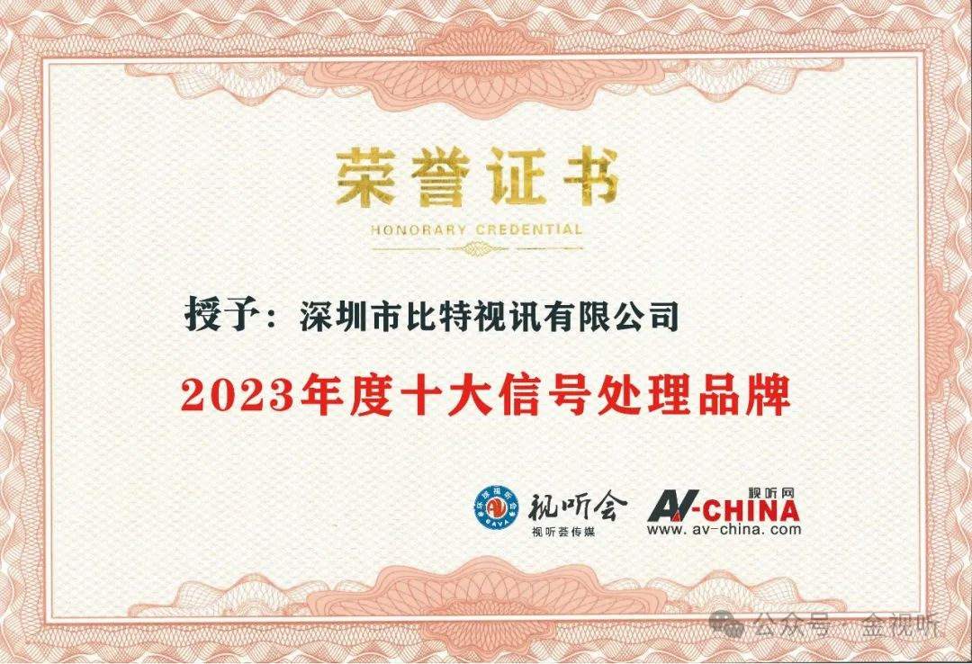 深圳市比特視訊有限公司憑借其在信號處理領域的研發(fā)實力和創(chuàng)新能力,榮獲了“2023年度金視聽·十大信號處理品牌”的榮譽。