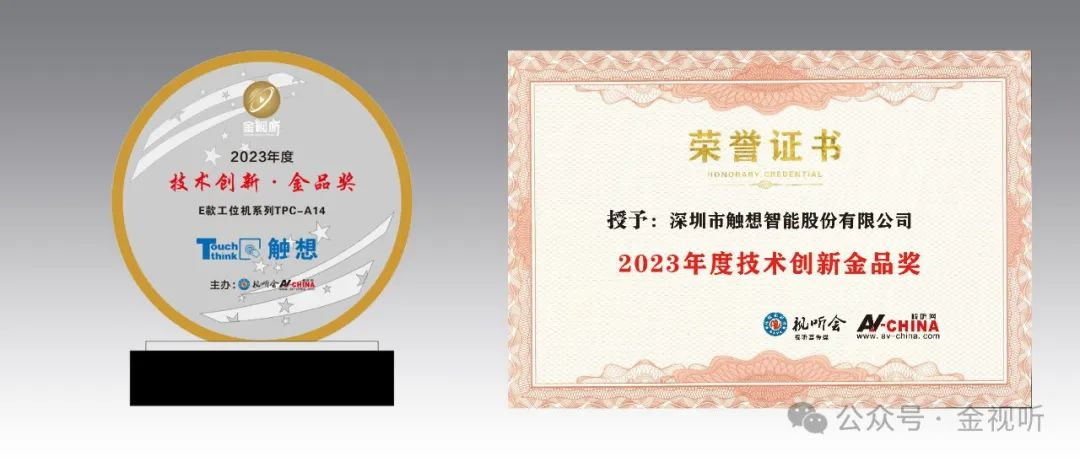 技術(shù)創(chuàng)新· 金品獎,是金視聽特為擁有獨(dú)特技術(shù)融入的經(jīng)典產(chǎn)品而設(shè)置的至高獎項(xiàng)。在眾多的行業(yè)產(chǎn)品中,經(jīng)市場調(diào)研、專家組委會評選,觸想智能全新E款工位機(jī)系列TPC-A14獲評“2023年度技術(shù)創(chuàng)新 · 金品獎”。