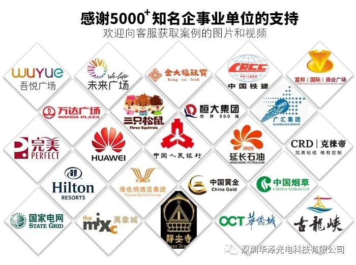 至今為止,華澤光電已為中國(guó)鐵建、國(guó)家電網(wǎng)、萬(wàn)達(dá)廣場(chǎng)、韶關(guān)人民銀行、上海靜安寺、柳州萬(wàn)象城、中山完美、南昌師范大學(xué)、青島泊里鎮(zhèn)Z府、恒大集團(tuán)、陜西延長(zhǎng)石油博物館,維也納酒店,三只松鼠、佛山禪城區(qū)煙C局、杭州希爾頓酒店,丹東鳳凰山景區(qū),華為香港展廳、遼寧雨桐博物館、漢中農(nóng)業(yè)科技館、新疆廣匯集團(tuán)等5000多知名客戶提供了服務(wù),有世界500強(qiáng)大型企業(yè)、有政F事業(yè)單位、有世界知名品牌、有跨國(guó)企業(yè)、有上市公司,客戶遍布大江南北,產(chǎn)品遠(yuǎn)及美英印加海外市場(chǎng),眾多客戶已為你先行驗(yàn)證實(shí)力!請(qǐng)放心合作!更多詳情請(qǐng)咨詢我們,歡迎索取案例高清圖片和視頻!歡迎參觀工廠。