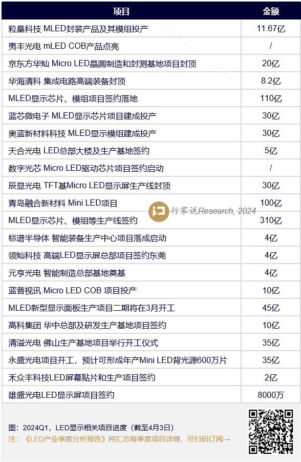 據(jù)行家說(shuō)Display不完全統(tǒng)計(jì),2024年1月以來(lái),已有超過(guò)20起LED顯示相關(guān)項(xiàng)目迎來(lái)簽約、封頂乃至是建成投產(chǎn)等新進(jìn)度,合計(jì)金額超過(guò)700億。
