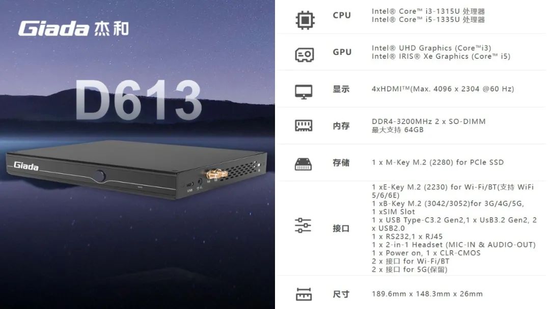 杰和科技D613采用Intel®第13代AlderLake處理器i3-1315U、i5-1335,比第11代性能提高19%,Intel® IRIS® Xe GPU (Core i5),圖形性能較上一代提升50%。支持4 x HDMI 2.0接口,提供多達(dá)4屏4K顯示(4096 x 2304@60Hz);支持1 x RJ45千兆網(wǎng)口,1 x E-Key M.2 (2230) for Wi-Fi/BT, 支持Wi-Fi 5, Wi-Fi 6, Wi-Fi 6E (CNVi),具備強(qiáng)大的網(wǎng)絡(luò)通信能力。支持1 x USB Type-C3.1,1 x USB3.1 2 x USB2.0,1 x RS232,1 x二合一音頻接口,拓展能力豐富,可以連接會(huì)議大屏、攝像頭、麥克風(fēng)、音響、U盤、擴(kuò)展塢、無(wú)線投屏等設(shè)備。