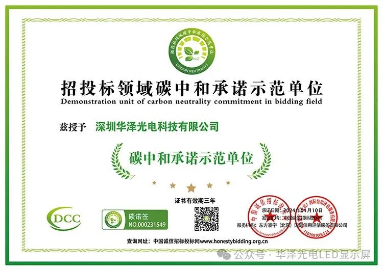華澤光電作為深耕LED顯示屏13年的高新技術(shù)企業(yè),積極響應(yīng)國家政策,勇于承擔(dān)企業(yè)社會責(zé)任,促進(jìn)技術(shù)研發(fā)創(chuàng)新,不斷探索并實(shí)踐綠色低碳發(fā)展道路。近日,華澤光電榮獲“招標(biāo)投標(biāo)領(lǐng)域碳中和承諾示范單位”,這一榮譽(yù)不僅是對華澤光電的高度認(rèn)可,更是對其在碳中和領(lǐng)域所做出的杰出貢獻(xiàn)的贊譽(yù)。