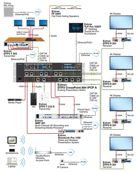 DTP3全系列基礎(chǔ)視頻傳輸帶寬為18Gbps,完全支持4K/60 4:4:4。每個(gè)視頻輸出都配備Extron Vector 4K技術(shù),無縫切換,徽標(biāo)嵌入功能,網(wǎng)傳接口可以輸入輸出擴(kuò)展到100米遠(yuǎn)的距離。內(nèi)置音頻矩陣采用了Extron的ProDSP技術(shù),內(nèi)置AEC功能和32*32的Dante網(wǎng)絡(luò)傳輸功能,可以級(jí)聯(lián)擴(kuò)展。內(nèi)置的200W功放,定壓定阻模式可以根據(jù)需求進(jìn)行調(diào)節(jié)。