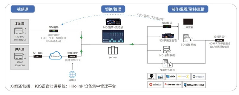 現(xiàn)有的基于基帶鏈路的節(jié)目制作及配套的錄機(jī)系統(tǒng)受限于硬件接口,無(wú)法支持9:16的豎屏格式,制作中心也無(wú)法靈活地進(jìn)行豎屏節(jié)目制作;而基于千視NDI IP化輕量化節(jié)目制作系統(tǒng),可全鏈路實(shí)現(xiàn)豎屏節(jié)目制作、包裝及錄制。信號(hào)源通過(guò)橫拍/豎拍方式,轉(zhuǎn)化為NDI IP網(wǎng)絡(luò)信號(hào),不再受前端輸入格式限制(16:9或9:16)。后端的NDI矩陣分發(fā)系統(tǒng)、導(dǎo)播切換系統(tǒng)、NDI多畫面監(jiān)看系統(tǒng)和NDI字幕制作包裝系統(tǒng)都能同步支持橫屏/豎屏業(yè)務(wù)場(chǎng)景,也可以對(duì)信號(hào)進(jìn)行直接推流;其中導(dǎo)播臺(tái)、多畫面監(jiān)看支持對(duì)視頻信號(hào)進(jìn)行旋轉(zhuǎn)、裁切等進(jìn)階功能。現(xiàn)在,傳統(tǒng)媒體制作中心可以通過(guò)NDI方案的植入,靈活地升級(jí)為豎屏演播室,以更低成本的整體改造方案提高綜合競(jìng)爭(zhēng)力。