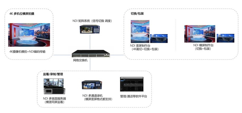 前端多機(jī)位攝像機(jī)正常橫屏拍攝,轉(zhuǎn)換為NDI IP信號(hào)進(jìn)入后端NDI切換臺(tái)。用于豎屏制作的NDI切換臺(tái),可對(duì)橫屏信號(hào)進(jìn)行裁切后生成多路豎屏素材,經(jīng)過(guò)切換包裝后輸出豎屏PGM信號(hào)。而用于橫屏制作的NDI切換臺(tái),則可直接利用橫屏信號(hào)源進(jìn)行制作包裝,輸出橫屏PGM信號(hào)。系統(tǒng)中NDI矩陣、NDI多畫面系統(tǒng)、NDI多通道錄機(jī)等,都支持豎屏/橫屏信號(hào)的處理。該方案要求前端拍攝采用4K拍攝,這樣通過(guò)后端裁切后才可保證是1080P高清PGM信號(hào)。顯然這個(gè)裁切方案的優(yōu)勢(shì)是可支持橫豎同屏制作,滿足演播室大屏/小屏一起播出的業(yè)務(wù)需求,但是對(duì)現(xiàn)場(chǎng)負(fù)責(zé)拍攝和豎屏裁切構(gòu)圖的老師提出更高的要求。