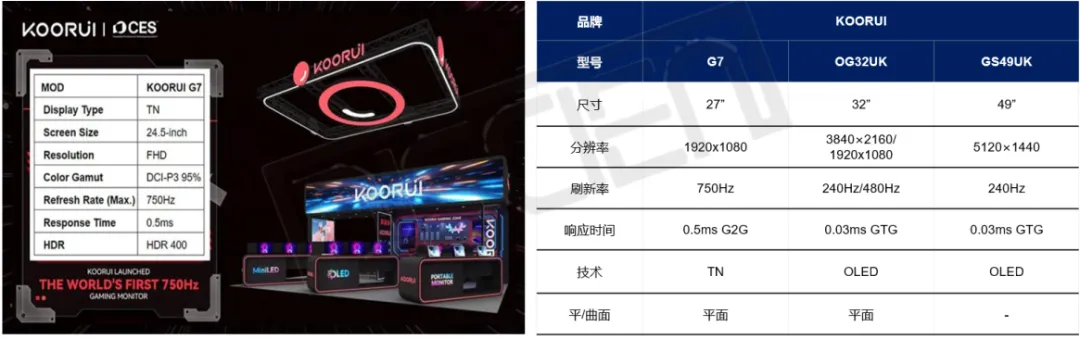 KOORUI(科睿):HKC子品牌KOORUI亮相CES。展出3款新品電競(jìng)顯示器,分別為G7、OG32UK和GS49UK。其中G7是一款搭載24.5” FHD 750Hz TN面板的電競(jìng)顯示器, 擁有全球最高的刷新率!其它兩款均為OLED電競(jìng)顯示器,其中OG32UK也是一款雙模顯示器,支持3840×2160/240Hz與1920×1080/480Hz之間切換。