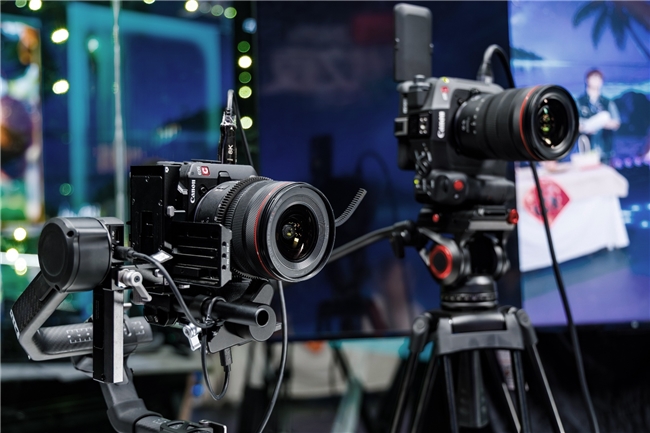 為滿足嚴(yán)苛的畫面要求,佳能“佳直播”部署了以佳能EOS C80和EOS C50組成的雙機(jī)位娛樂團(tuán)播直播解決方案,主機(jī)位采用的是EOS C80搭配RF15-35mm F2.8 L IS USM,游機(jī)位采用的是EOS C50搭配RF14-35mm F4 L IS USM。