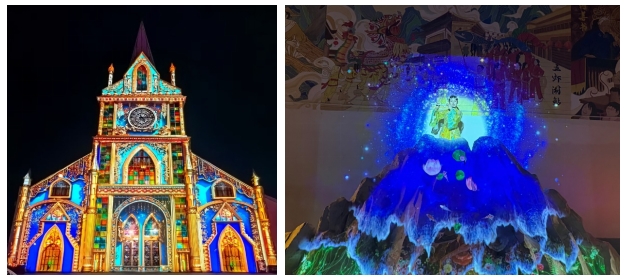 令人贊嘆不已的“玫瑰之約”教堂立面投影(左)和“仙影闌珊”仿真花裙投影(右)