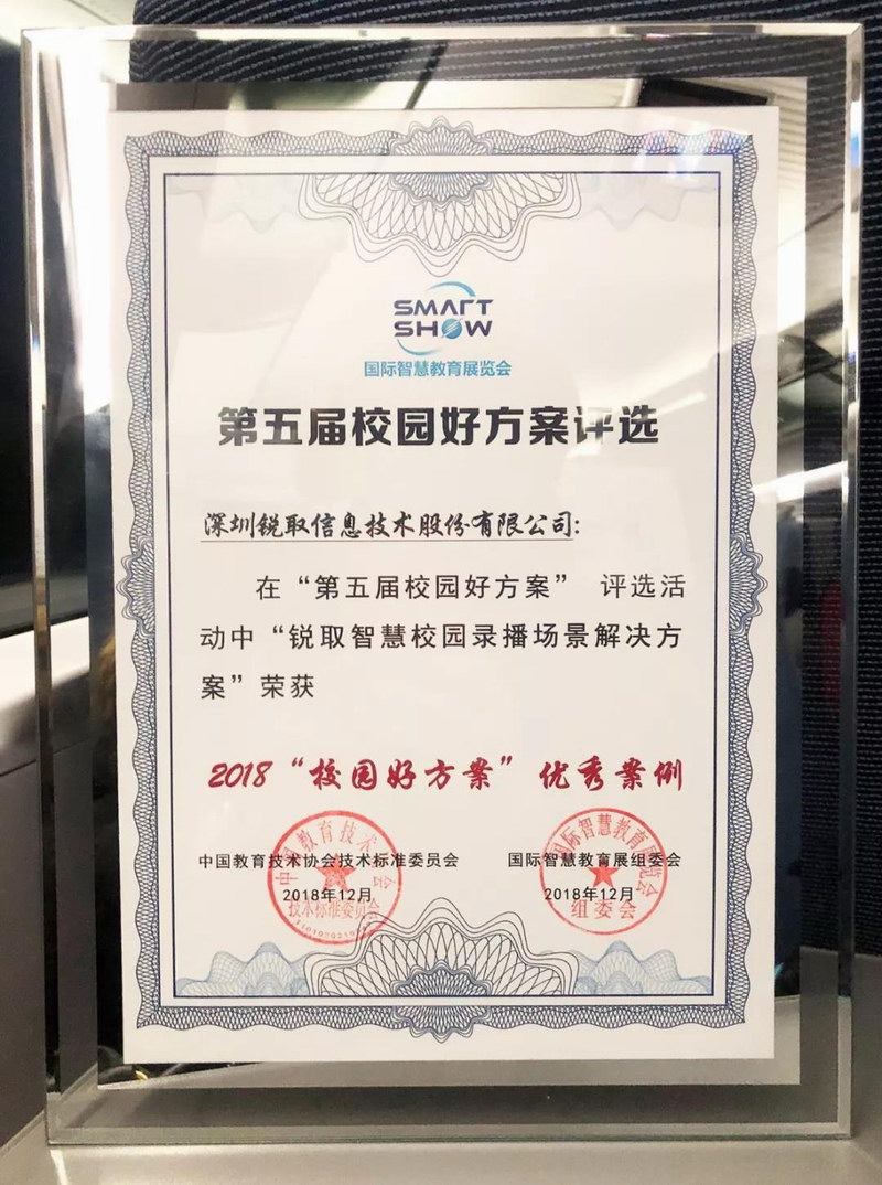 在SmartShow第五屆校園好方案評選活動中,銳取——智慧校園全場景錄播解決方案,經中國教育技術協會教育測量與評價專業(yè)委員會評審,從七百多個參選方案中脫穎而出,躋身百強,獲“優(yōu)秀方案”榮譽!第五屆校園好方案評選活動,旨在甄選百城千校認可的標桿型方案,推動“教育+技術”的進化變革,是國內首個以用戶使用角度為評定標準的教育信息化解決方案評選。榮譽時刻 獲權威機構雙重認可12月9日,2018國際教育信息化峰會暨國際智慧教育展覽會第二日,第五屆校園好方案評選頒獎儀式在北京國家會議中心隆重召開。中國教育技術協會常務副會長張少剛、中國教育技術協會副會長兼秘書長丁新、中國教育技術協會副會長鐘曉流等領導嘉賓
